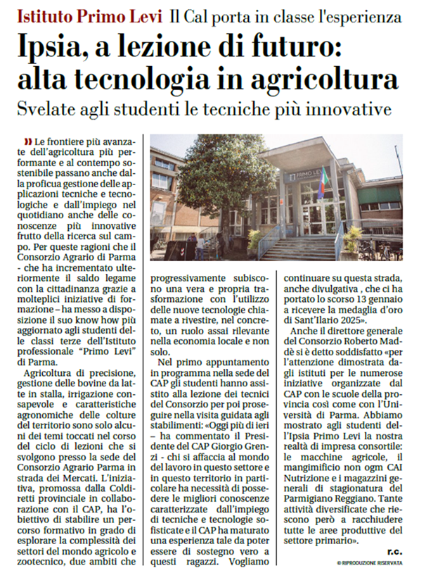 Nell’ambito del concorso provinciale Coldiretti “Per fare un frutto ci vuole un fiore. Conosciamo l’agricoltura locale, l’origine del cibo e la Dieta mediterranea”, lunedì 17 e 24 febbraio 2025 le classi 3L autoriparatori e 3C operatori meccanici sono state accompagnate al Consorzio Agrario di Parma dal professor Francesco Gallina, coordinatore del progetto Coldiretti presso l’Ipsia “Primo Levi”, e dai professori Diego Gambuzza e Elena Peia.