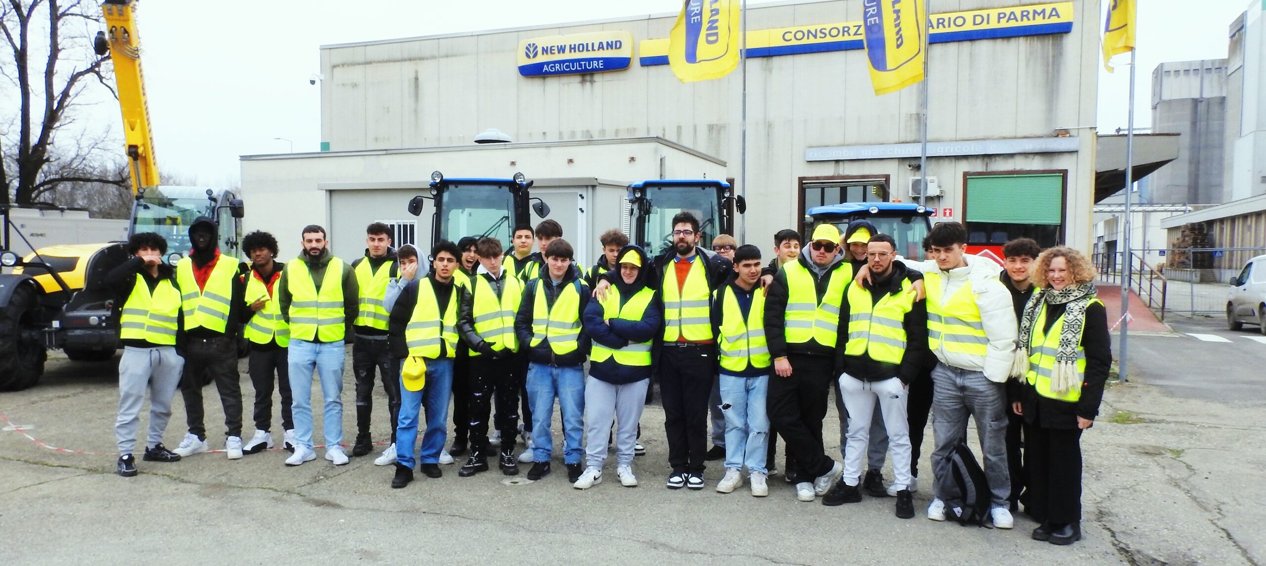 Prima di esplorare gli spazi del Consorzio, Irene Ghinizzini (Coldiretti Parma) e Francesca Salati (Segreteria Direzione Consorzio) hanno accolto i ragazzi, guidati poi alla scoperta dell’agricoltura di precisione 4.0 e della zootecnia dagli esperti Francesco Polonelli e Carlo Fornari. L’integrazione tra agricoltura di precisione, tecnologie 4.0 e innovazione meccanica rappresenta infatti il futuro del settore, promuovendo sostenibilità, efficienza e qualità agroalimentare su un territorio – quello della Food Valley – di capitale importanza sul piano nazionale e internazionale. L’agricoltura di precisione, infatti, rivoluziona il settore primario ottimizzando le risorse e migliorando la produttività grazie a tecnologie avanzate che integrano sensori, intelligenza artificiale e droni per monitorare il suolo, la crescita delle colture e il fabbisogno idrico, riducendo sprechi e aumentando l’efficienza. L’irrigazione intelligente permette un uso mirato dell’acqua, riducendo consumi e impatto ambientale. La meccanizzazione avanzata include trattori New Holland (di cui il CAP è concessionario) con guida automatica e gestione digitale, migliorando la precisione e la sostenibilità delle lavorazioni. I ragazzi, sotto la supervisione di Fabio Bolsi e Alex, hanno esaminato i modelli New Holland, visitato un negozio di forniture e ispezionato le officine.